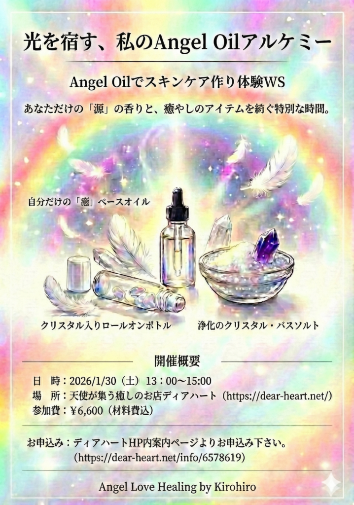 1月31日 天使のクラフトヒーリングワークショップご案内 2026年1月15日 投稿者: kirohiro 未分類 お申し込みはディアハートさんのサイトからお願いいたします。 ⇨ 天使が集う癒やしのお店ディアハート 天使のクラフトヒーリングWS 投稿ナビゲーション 過去の投稿前 ヒーリングタロット サンデーKOKO 夏の開運ナビ!癒しと占いの1DAY西荻窪占いカフェ